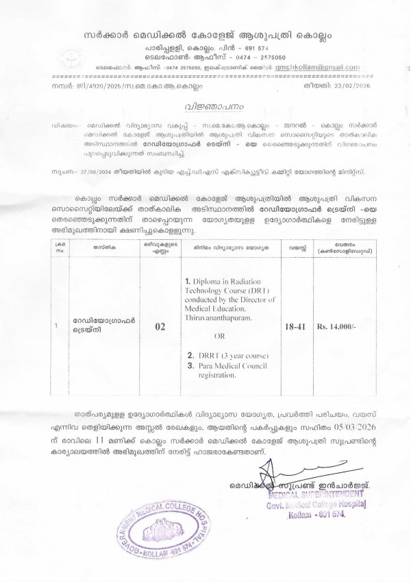 GMCH Kollam-HDS-Radiographer Trainee-Walk In Interview