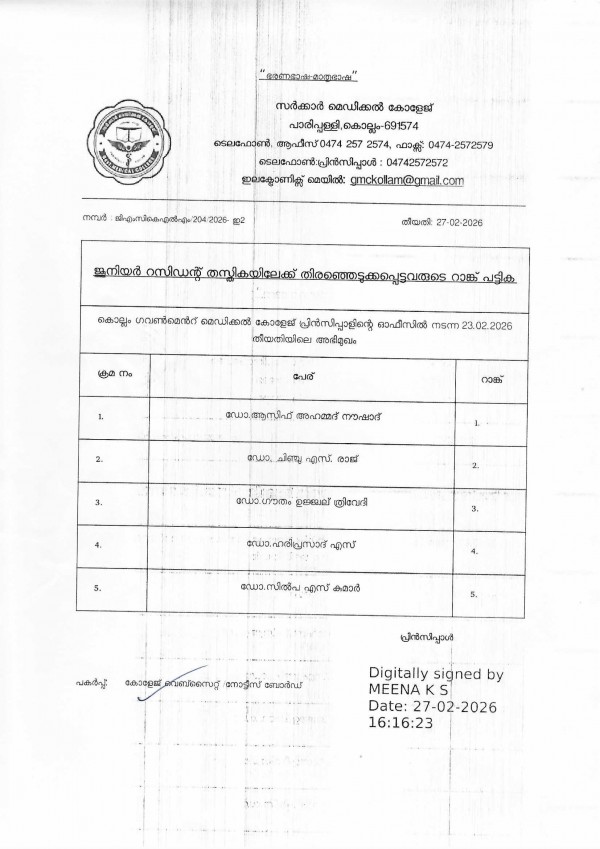 RANK LIST-JUNIOR RESIDENT- GMC KOLLAM