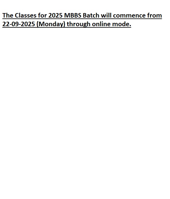 News |The Classes for 2025 MBBS Batch will commence from 22-09-2025 (Monday) through online mode.