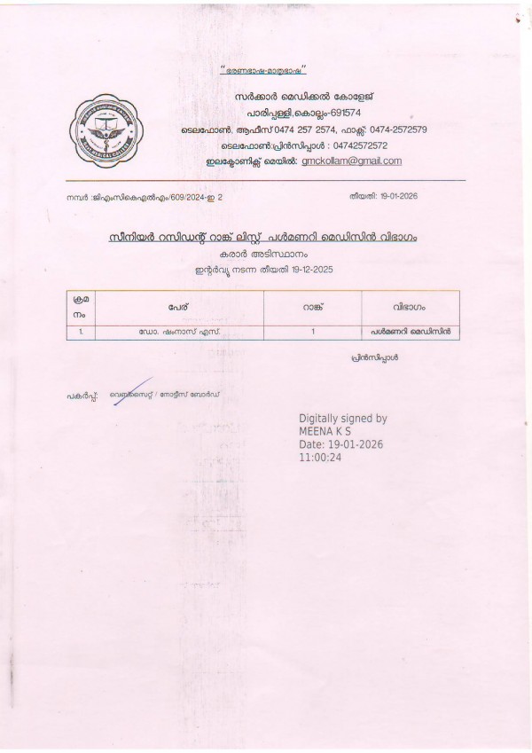 RANK LIST-SENIOR RESIDENT- PULMONARY MEDICINE GMC KOLLAM